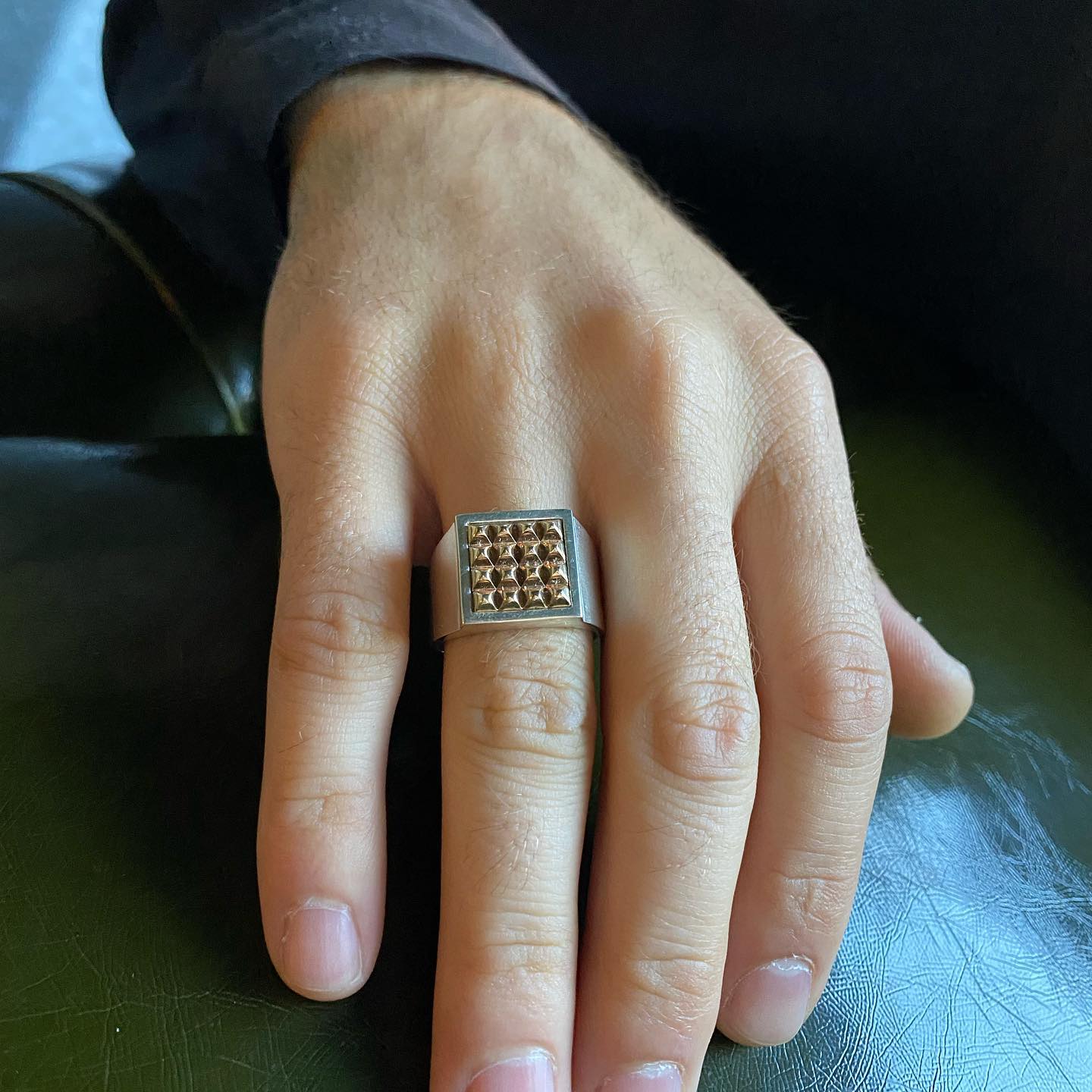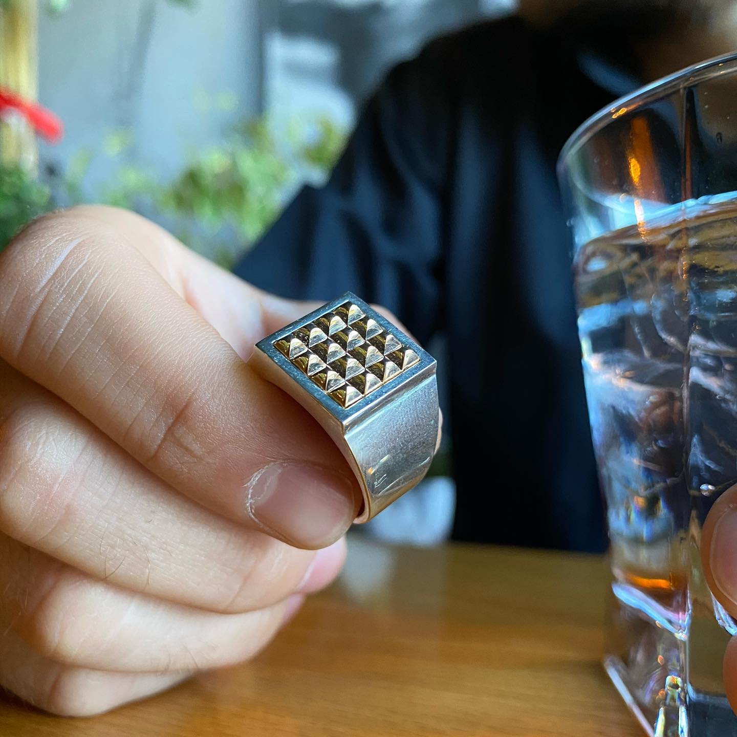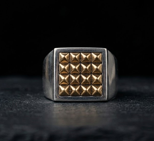 • Geometrik Derinlik ve Kontrast: Yüzüğün üst tablasında yer alan asimetrik yerleşimli, piramit formlu bronz işlemeler, ışıltı ve gölge oyunlarıyla ürüne çok boyutlu bir derinlik katar. Bronzun sıcak tonu ile gümüşün soğuk asaleti arasındaki bu kusursuz zıtlık, modern bir güç simgesidir.