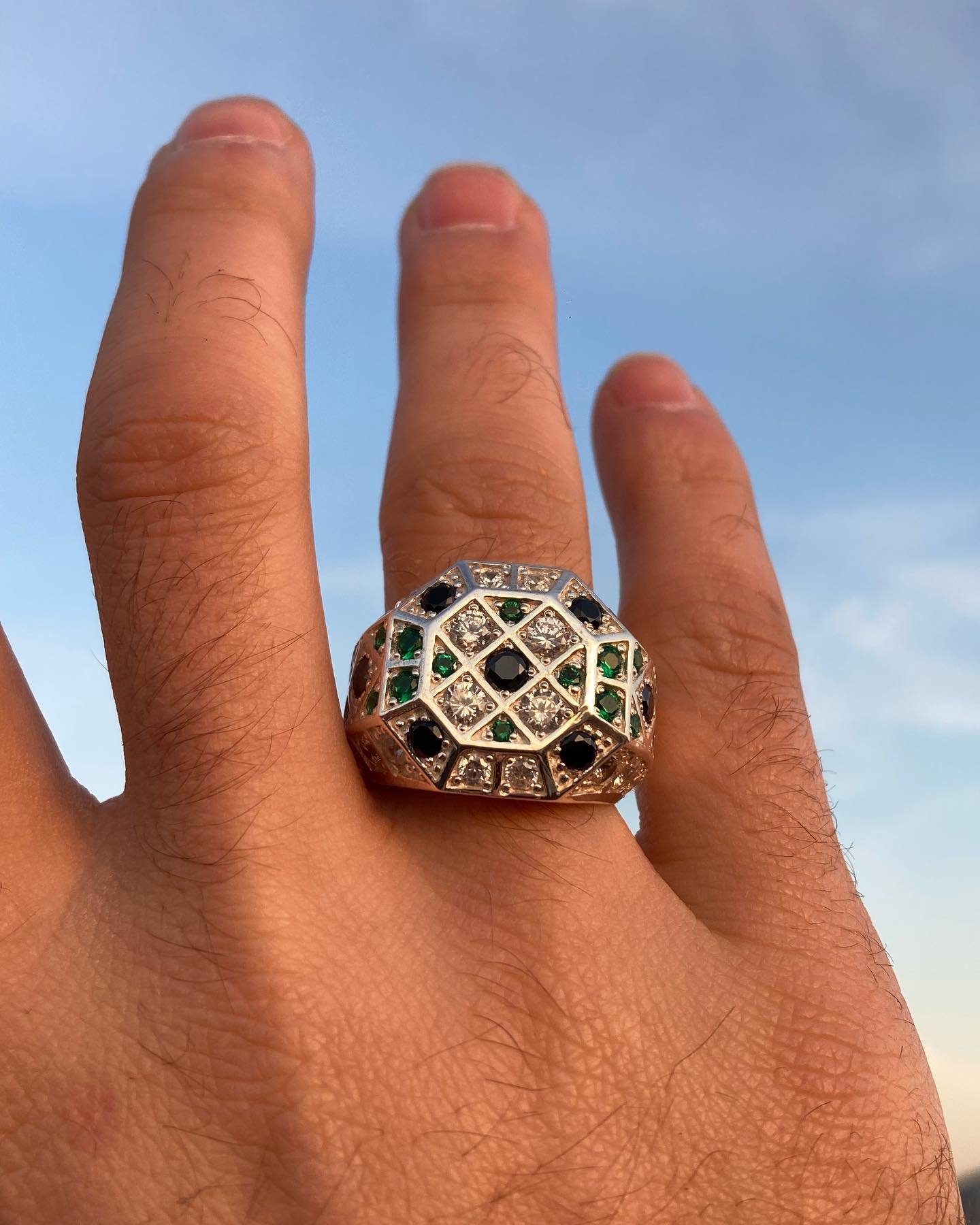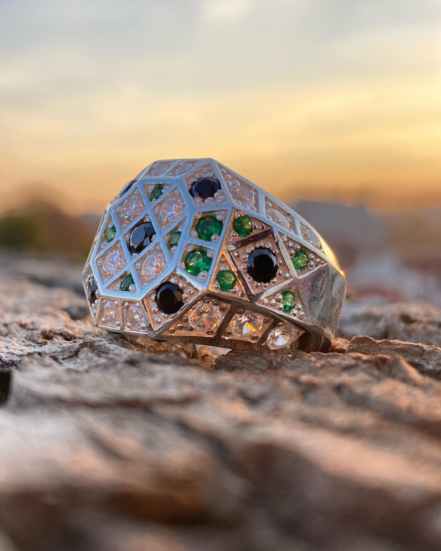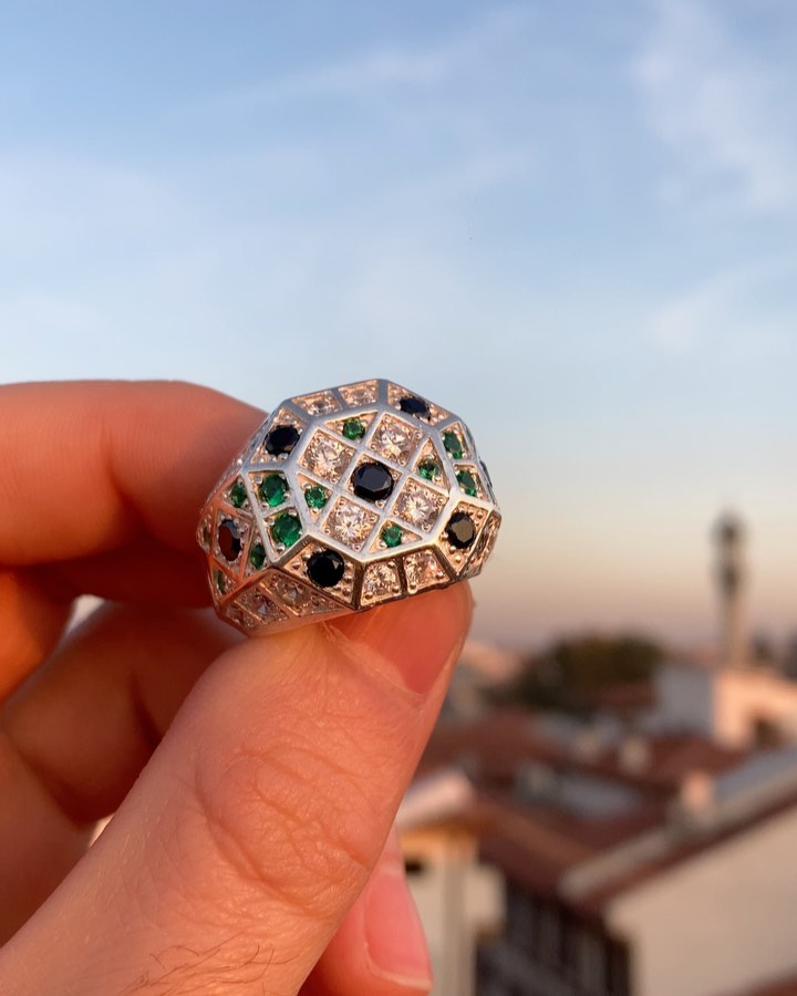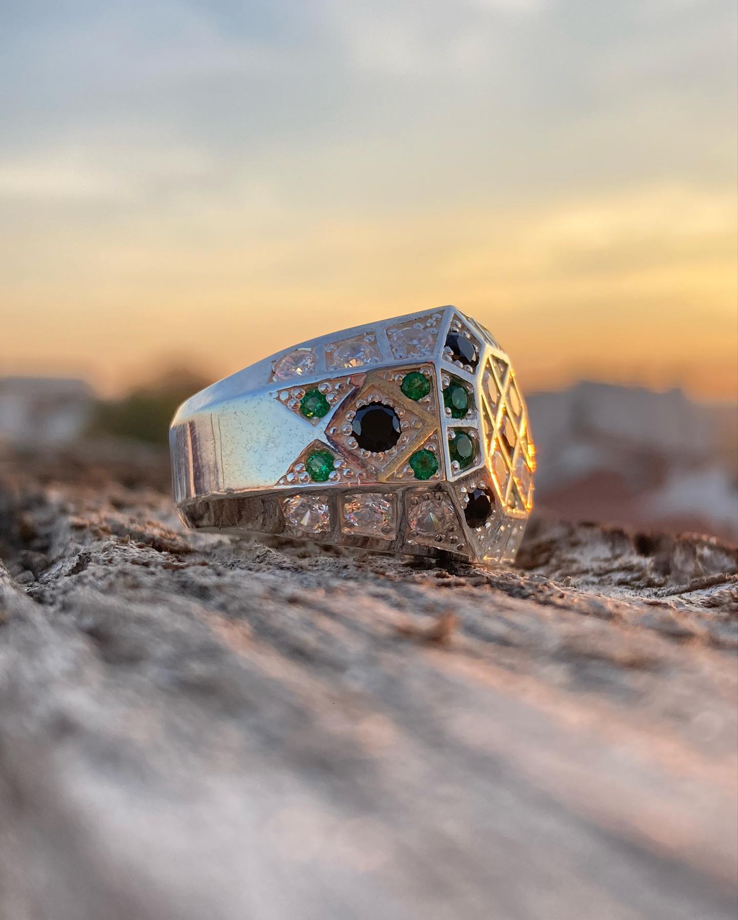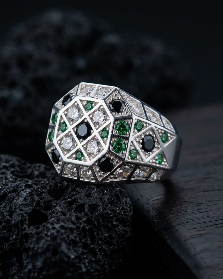 Bu yüzük, sıradan bir aksesuarın çok ötesinde, güç ve estetiğin parmağınızdaki sessiz manifestosudur. Keskin mimari hatları, doğanın en canlı renkleri olan siyah ve yeşil taşlarla harmanlanarak zamansız bir şıklık sunuyor. Modern erkeğin duruşunu simgeleyen bu tasarım, el işçiliğinin en ince detaylarını her açıda hissettiriyor. Girdiğiniz her ortamda bakışları üzerinize çekecek bir imza parça.