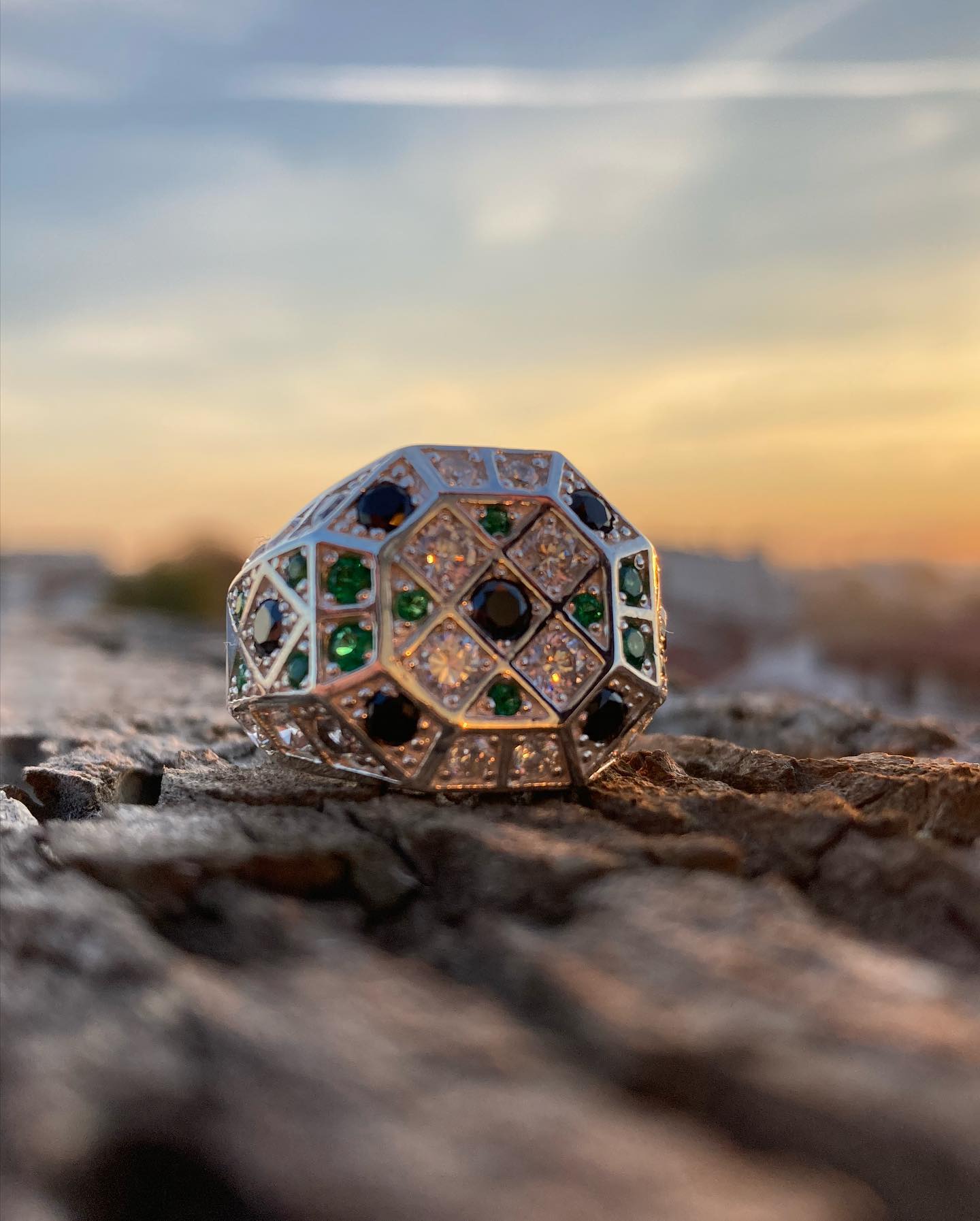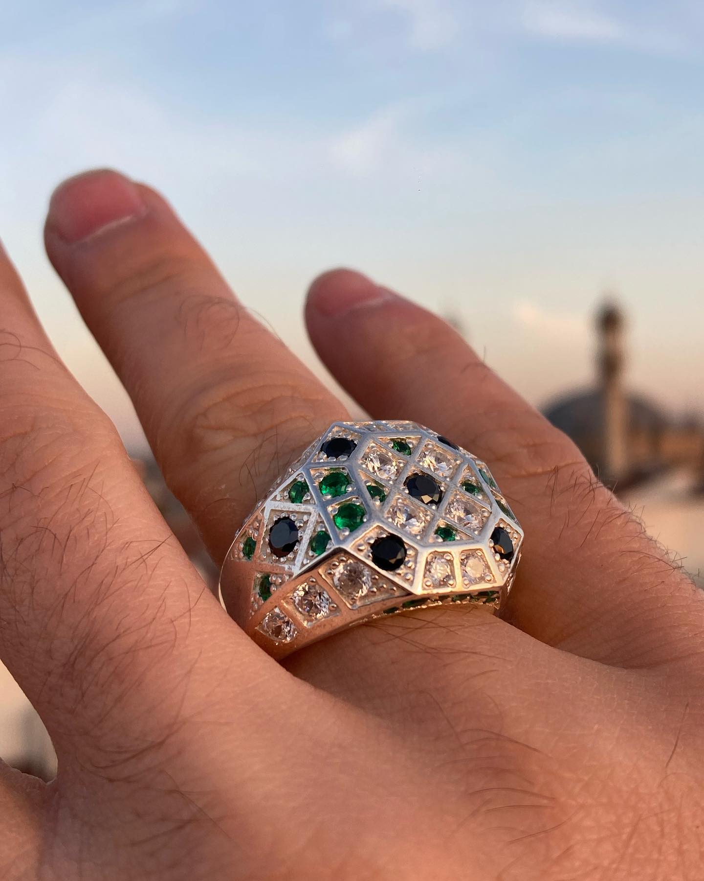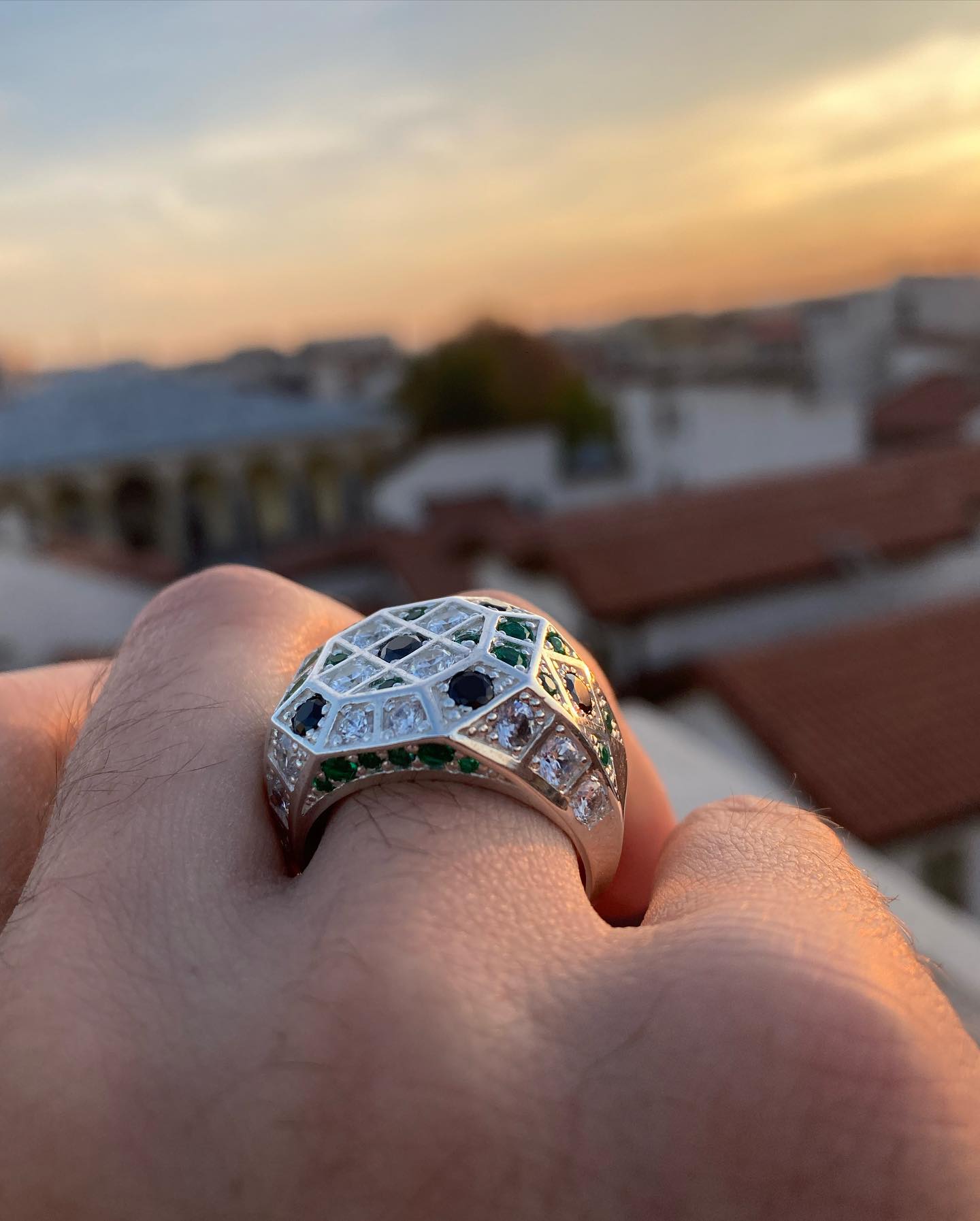 Geleneksel motiflerin modern mimari dokunuşlarla buluştuğu bu özel tasarım yüzük, tarzında fark yaratmak isteyen erkekler için tasarlandı. Gövdesindeki keskin geometrik hatlar, üzerindeki değerli taşların ışıltısıyla mükemmel bir kontrast oluşturuyor.