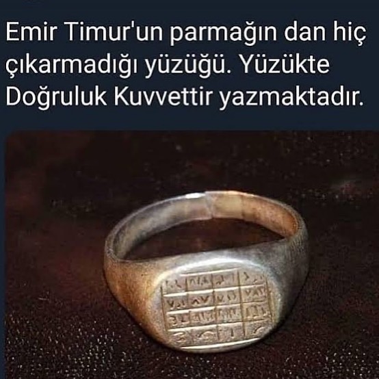 Sır: Üzerinde ebcet hesabıyla Farsça işlenmiş, Timur’un hayat felsefesi olan o sarsılmaz söz: “Rasti Rusti” (Doğruluk Kuvvettir).